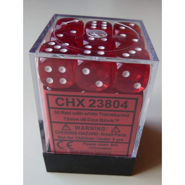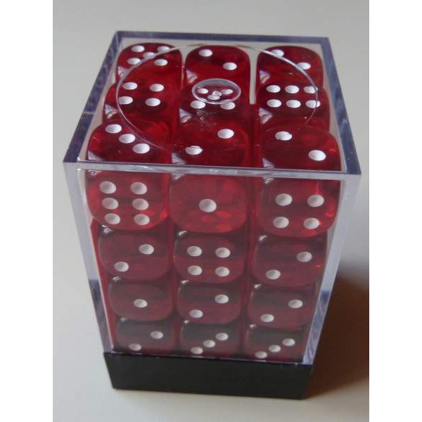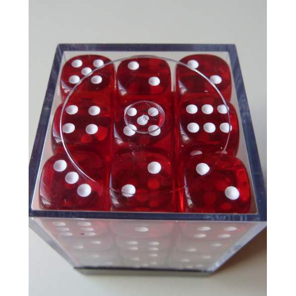 Each Set contains 36 Translucent Red 12mm d6 dice with white pips (DT1204) in 02804 Display Case w/Lid