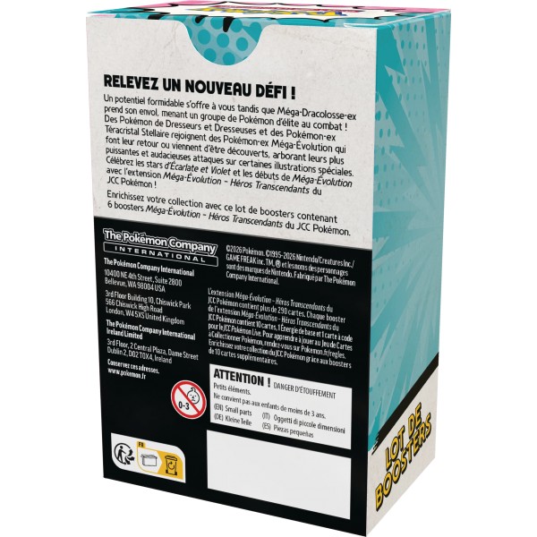Enrichissez votre collection avec ce lot de boosters contenant six boosters Méga-Évolution – Héros Transcendants du JCC Pokémon.