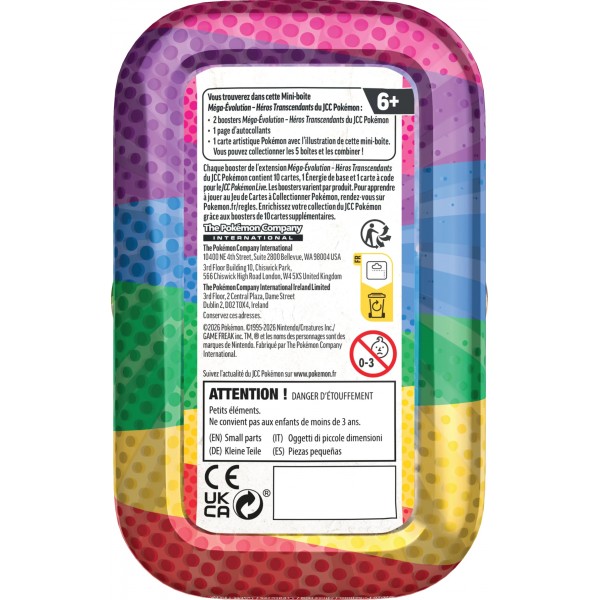 Chaque mini-boîte contient deux boosters du JCC Pokémon, une page d’autocollants et une carte artistique Pokémon représentant l’illustration de la boîte.